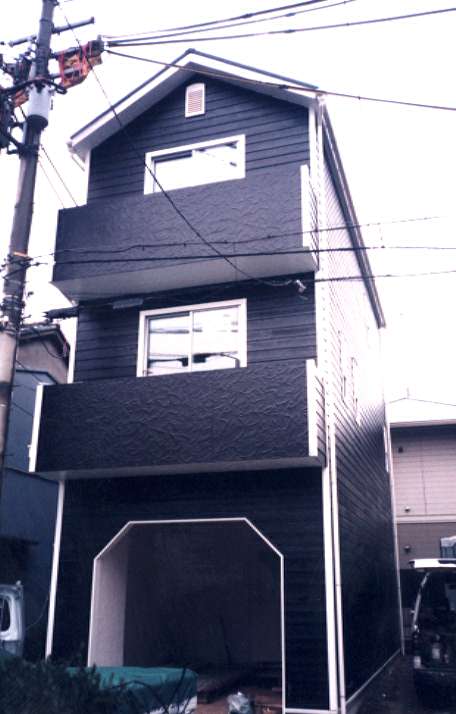 間口の狭い(3.64m)3階建住宅。敷地も50u(15坪)です。外壁の色は施主様の希望ですが、少し暗いかなー。