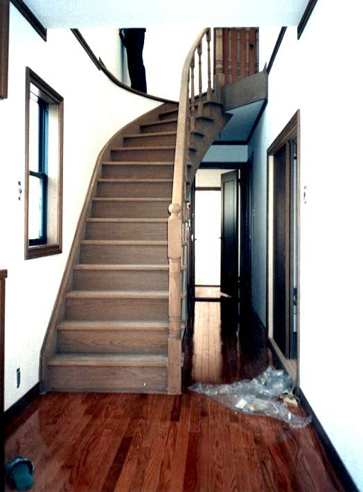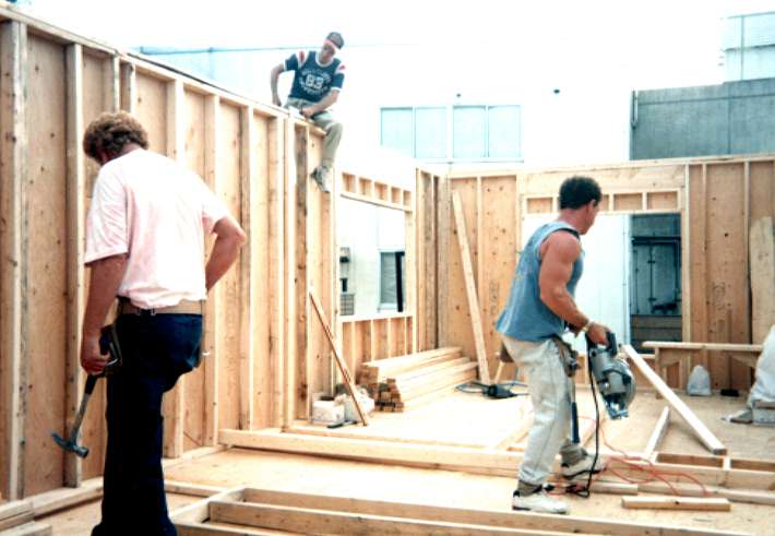 カナダ人クルー3名で1Fフレーム工事中。電気ノコギリを持っているリーダーのピーターは仕事終了後、毎日、スポーツジム通い。彼いわく「良いフレーマーは重い物を持てる体力が必要だ」。