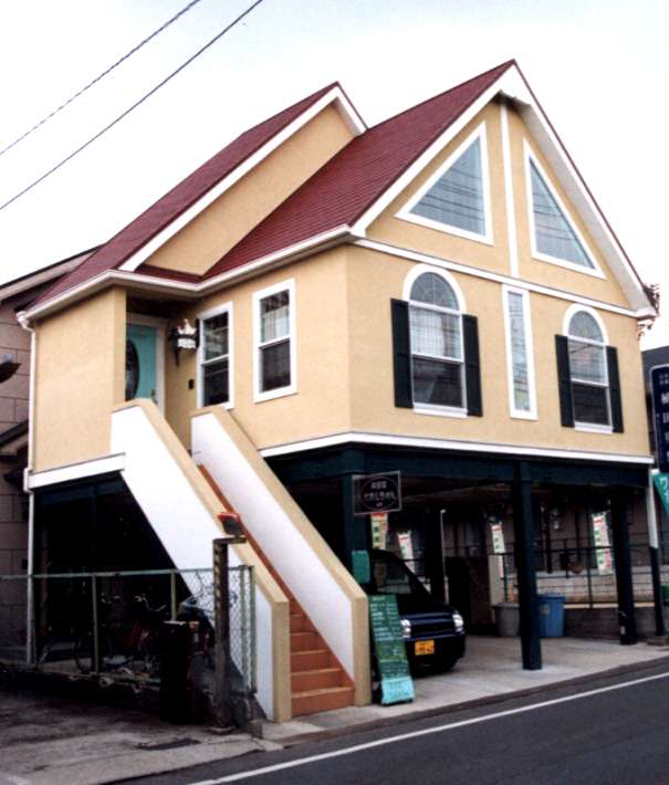これも、塗装工事協力業者の奥さんが自宅兼事務所の前で、パーマ店をしたいとのことで、建てたものです。1Fを重量鉄骨の車庫、2Fを店舗に。