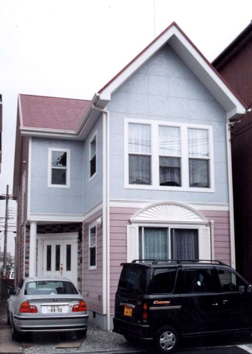 外壁はピンクとネズミ色であっさりとまとめる。