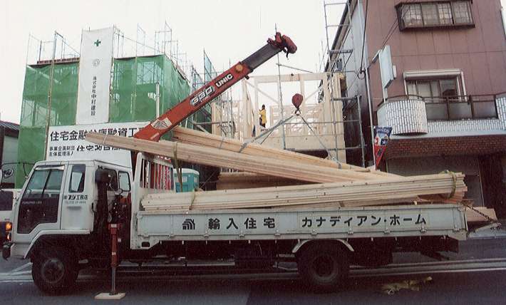 4tユニック車からランバーを積み下ろし中。