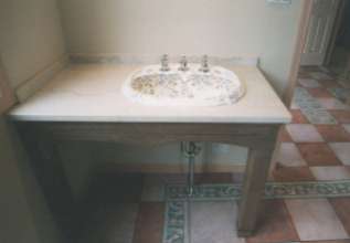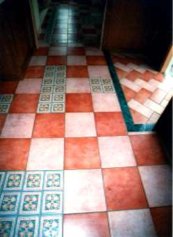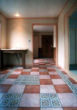 1階の玄関土間(大理石の框の右側部分)に続くフロアーは大阪ガスの床暖房(給湯式)設置の上に輸入タイルを貼る。